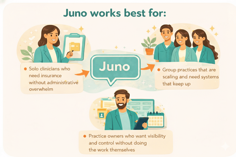 If insurance feels like a constant background stressor, Juno is designed to remove it. We handle the operational friction so your practice can run cleanly, predictably, and sustainably. When the backend works, more people get help. And that’s the point.